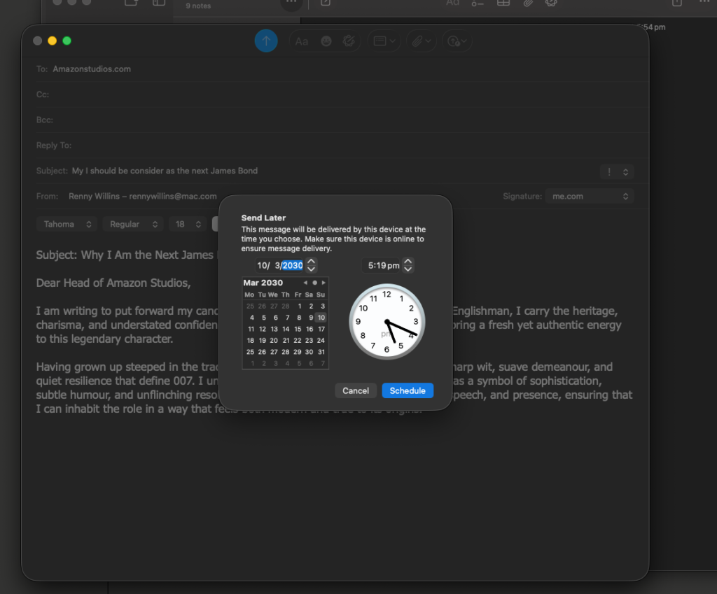 But then, Apple released macOS 26 and iOS 26. And with them, they’ve perfected the “Send Later” feature in Mail and Messages. And I’m going to go out on a limb here and say it’s the most important invention since the heated beret.