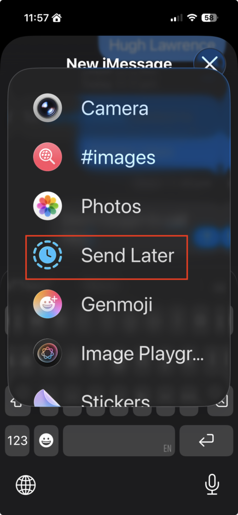 The Menu: You might have to scroll a bit depending on how many stickers of cats you’ve downloaded, but find “Send Later.”