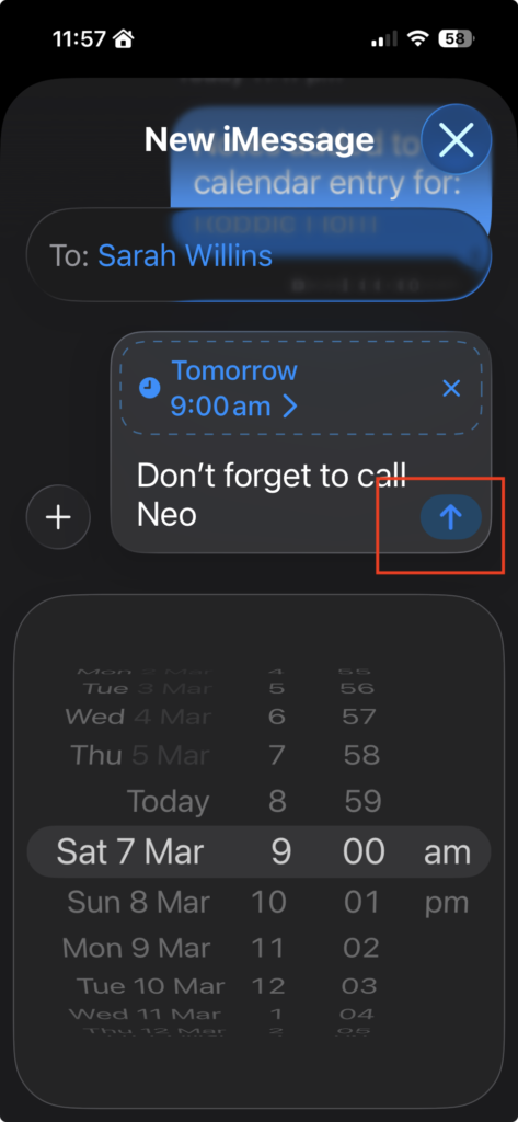 - The Timer: A slider appears. Dial in the date and time, hit the blue arrow, and the message will sit there with a dashed border, waiting patiently to pounce. But sometimes you’ll noticed with a knitted brow that this option is missing… this is because your chosen recipient needs to be using an iPhone – as of course they should be. This won’t work if you are sending the message to a Haemorrhoid, sorry Android, phone.