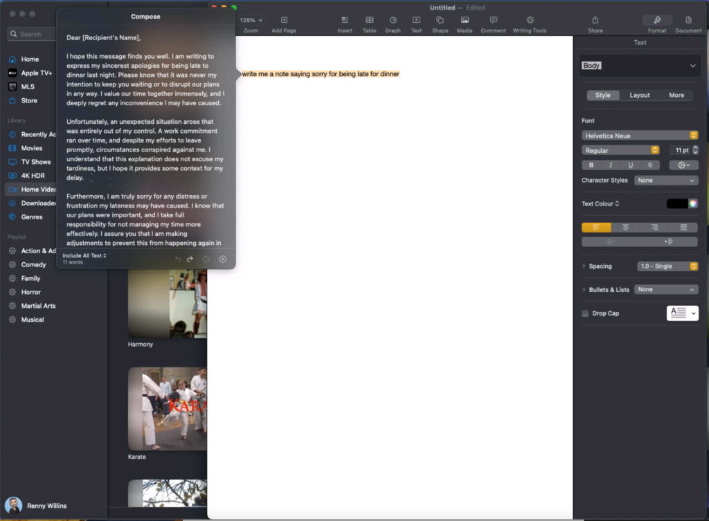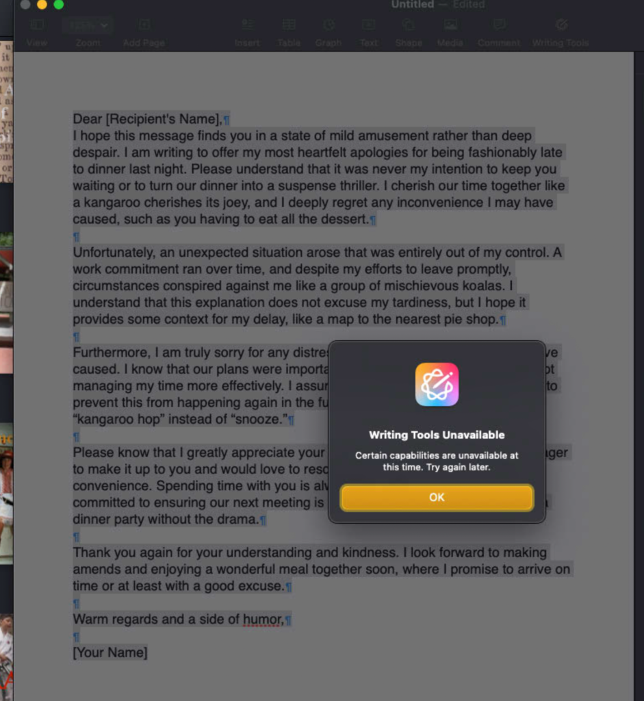 Asking Pages, one of the many Apple applications that support Writing Tools, to write me a long winded letter about being late for dinner produced a fair enough attempt but it used ChatGPT to do it and I had to start writing a sentence before it would even try. Seems it needed something to get it going.